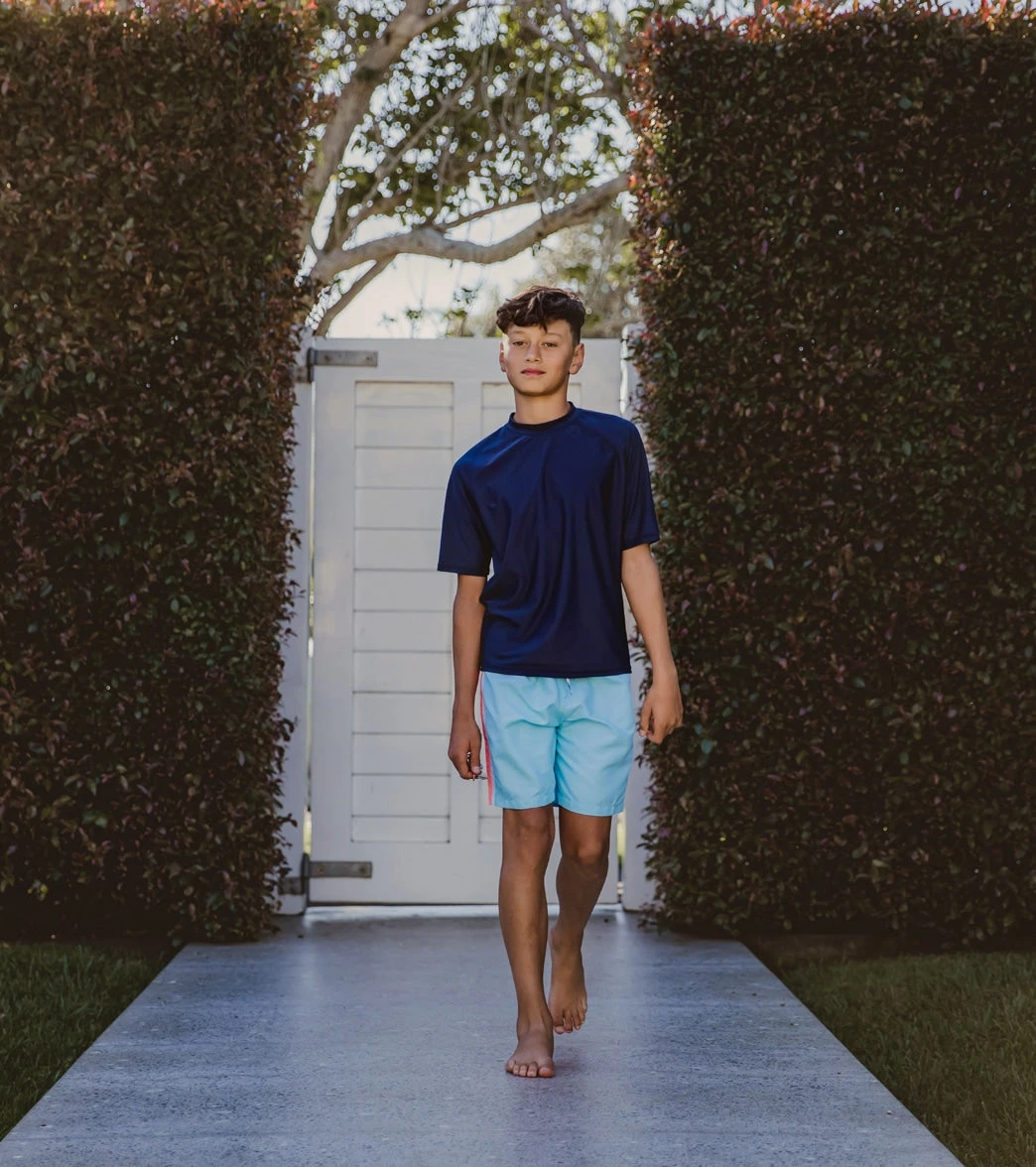 Retro days lying by the pool! The Blue Retro Stripe Volley Shorts are a sporty take on a classic. Featuring a solid blue front and back, with navy and peach side panels.