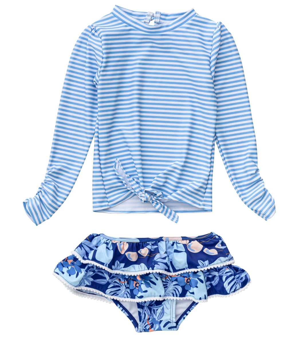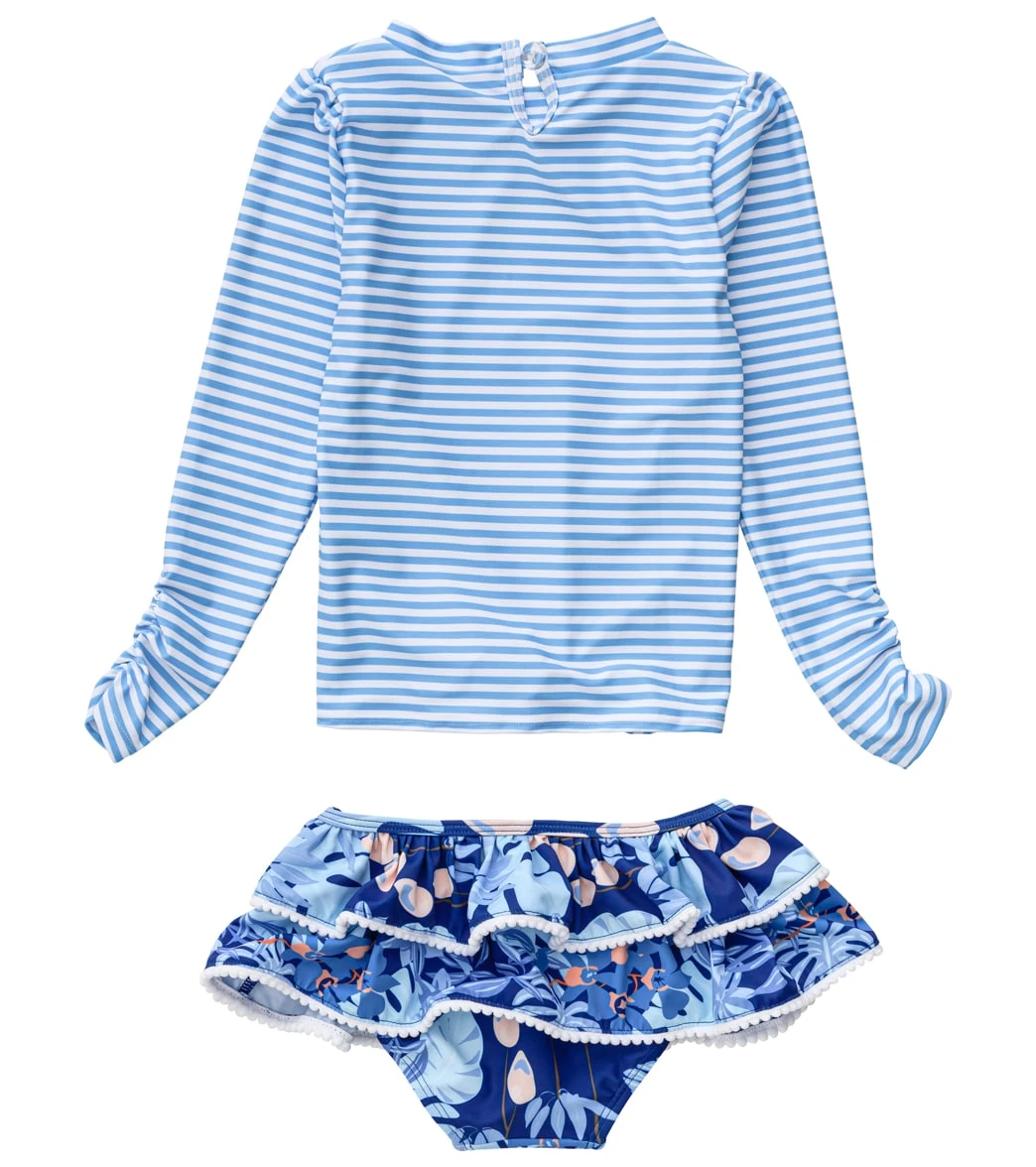 Perfect for the paddling pool, The Mango Tango Ruffle Set comes with a blue and white stripe long sleeve top and Mango Tango print ruffle bottoms. Made from ECONYL regenerated nylon fabric with UPF 50+ Sun Protection, you will help to protect the planet while protecting their skin.