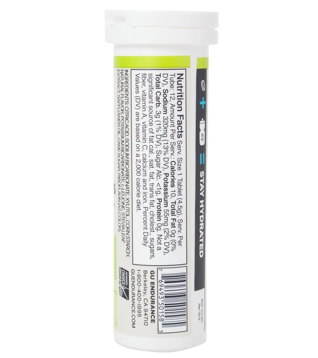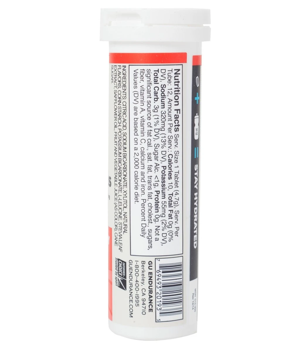 Created primarily for hydration, GU Hydration Drink Tabs offer the athlete a low-calorie drink option. GU Hydration Drink Tabs are reformulated with xylitol to help reduce gastrointestinal distress when compared to sorbitol. Sodium, the primary electrolyte lost in sweat, helps maintain water balance. Use GU Hydration Drink Tabs before, during, and after exercise to hydrate and replenish electrolyte levels.