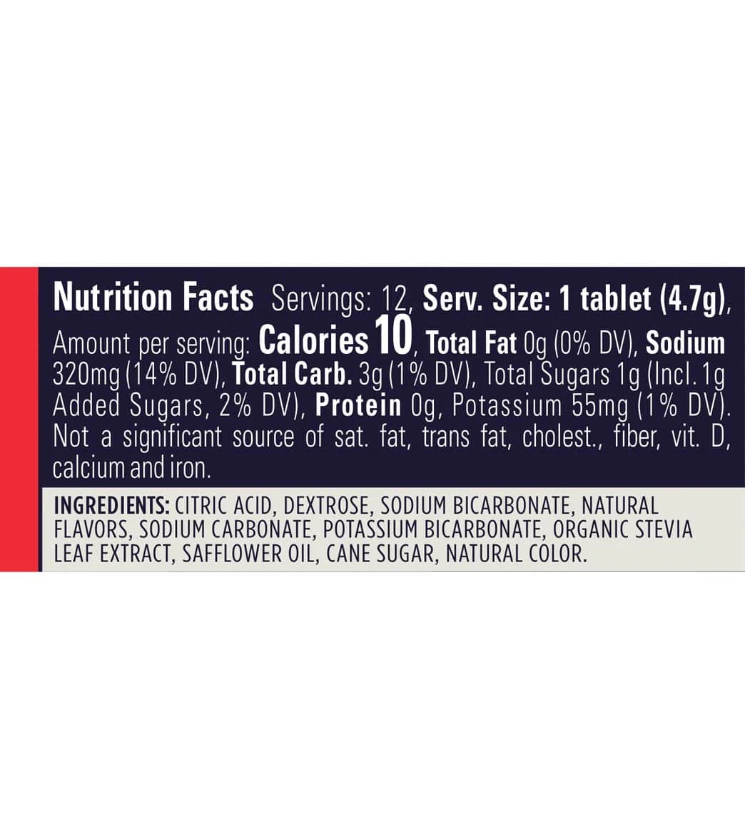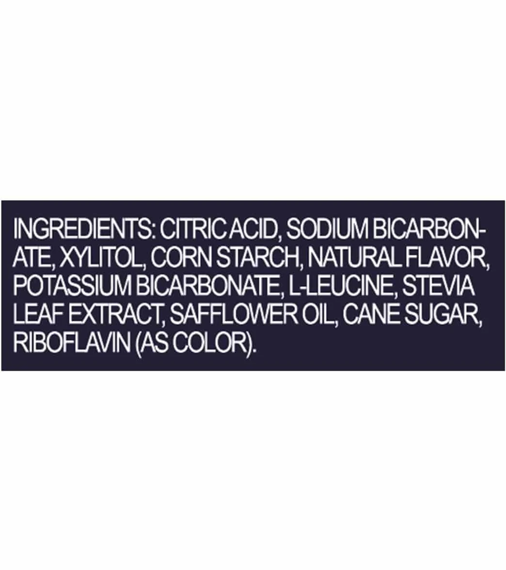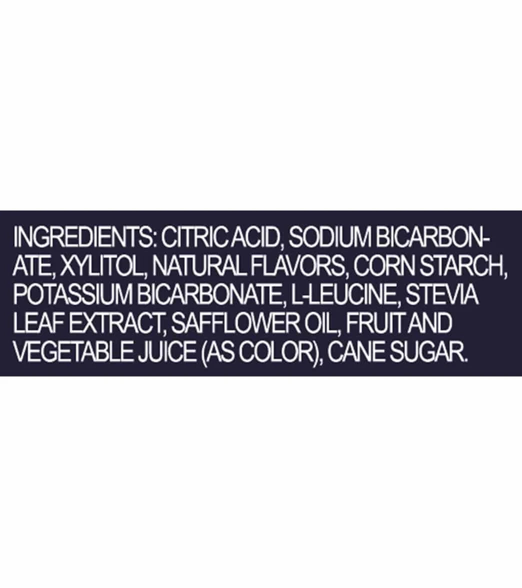 Citric Acid, Sodium Bicarbonate, Xylitol, Natural Flavors, Corn Starch, Potassium Bicarbonate, L-Leucine, Cane Sugar, Stevia Leaf Extract, Safflower Oil, Fruit and Vegetable Juice (As Color).